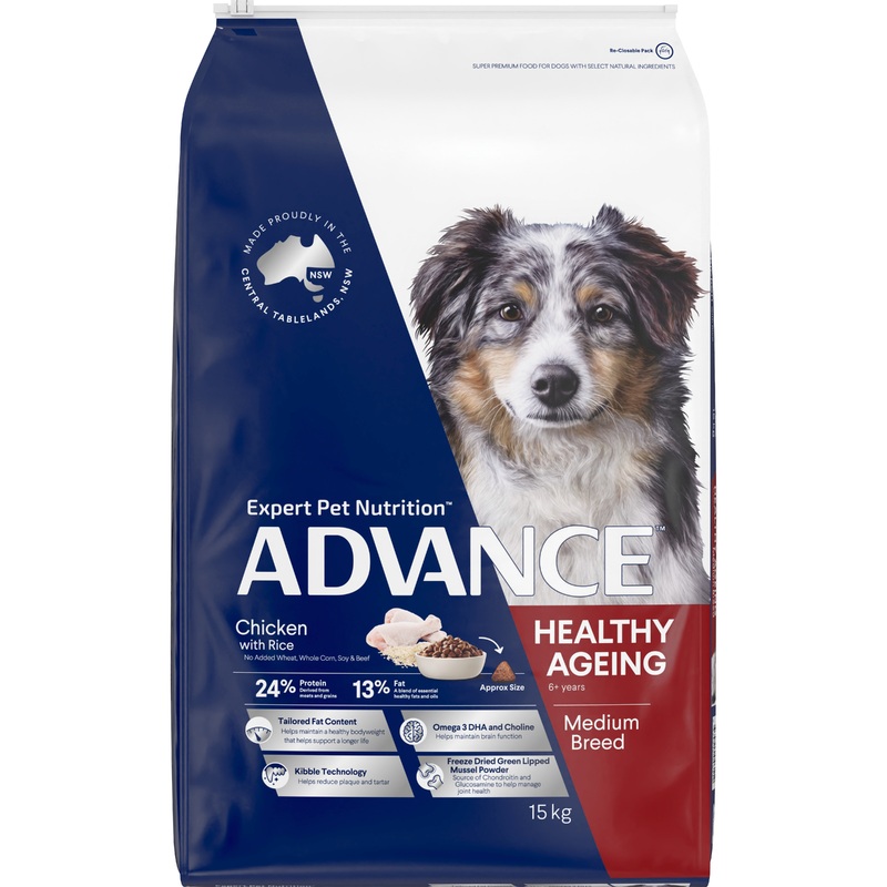 The perfect addition to any dogs diet, Advance’s Medium Breed Healthy Ageing Chicken with Rice dog food is scientifically formulated to deliver optimal nutrition and nourish your dog in their mature years.